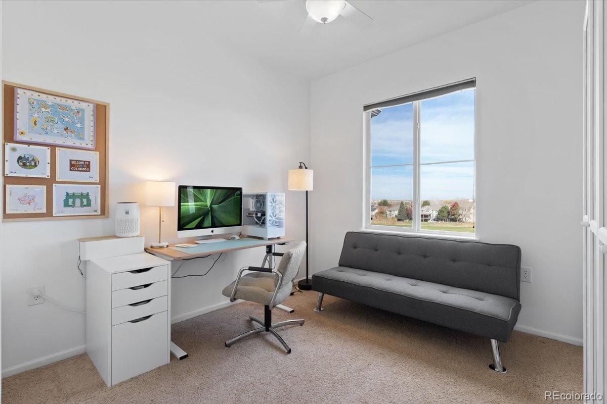 Welcome to this bright and inviting three-bedroom, two-and-a-half-bath corner-end home filled with natural light and beautiful golf course views from every room. The open layout features nine-foot ceilings, recessed lighting, and lighted ceiling fans in the living room and all bedrooms, creating a warm and welcoming atmosphere. The kitchen has been tastefully updated with new Quartz countertops, stainless steel appliances--including a refrigerator--and an oversized stainless steel sink. Newer wide plank LVP flooring and fresh interior paint give the home a modern, move-in-ready feel. You'll love the gas fireplace and built-in bookshelves in the living room, while enjoying beautiful views. The primary bathroom has a custom tile floor, a newer vanity, and lighting. Step outside to the large fenced backyard with a spacious patio overlooking the golf course--an ideal spot for morning coffee or evening gatherings and BBQs. This home also features a newer roof and siding. Enjoy maintenance-free living with landscaping and snow removal included, giving you more time to enjoy the good life. The attached one-car garage, including washer and dryer, window coverings, and convenient proximity to the neighborhood pool, make this home as practical as it is charming. With its thoughtful updates, easy-care lifestyle, and serene golf course setting, this home offers the perfect combination of comfort, style, and convenience.