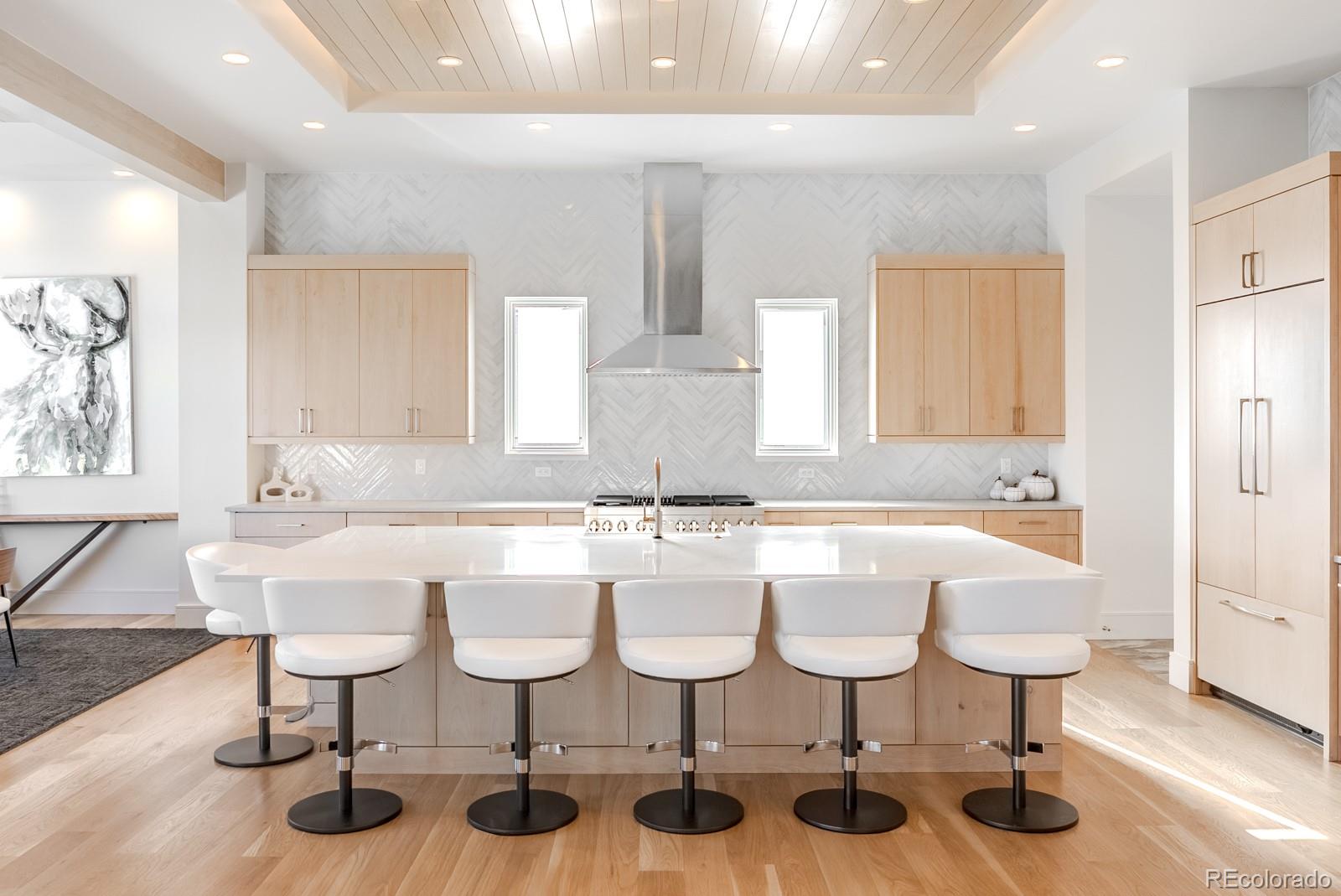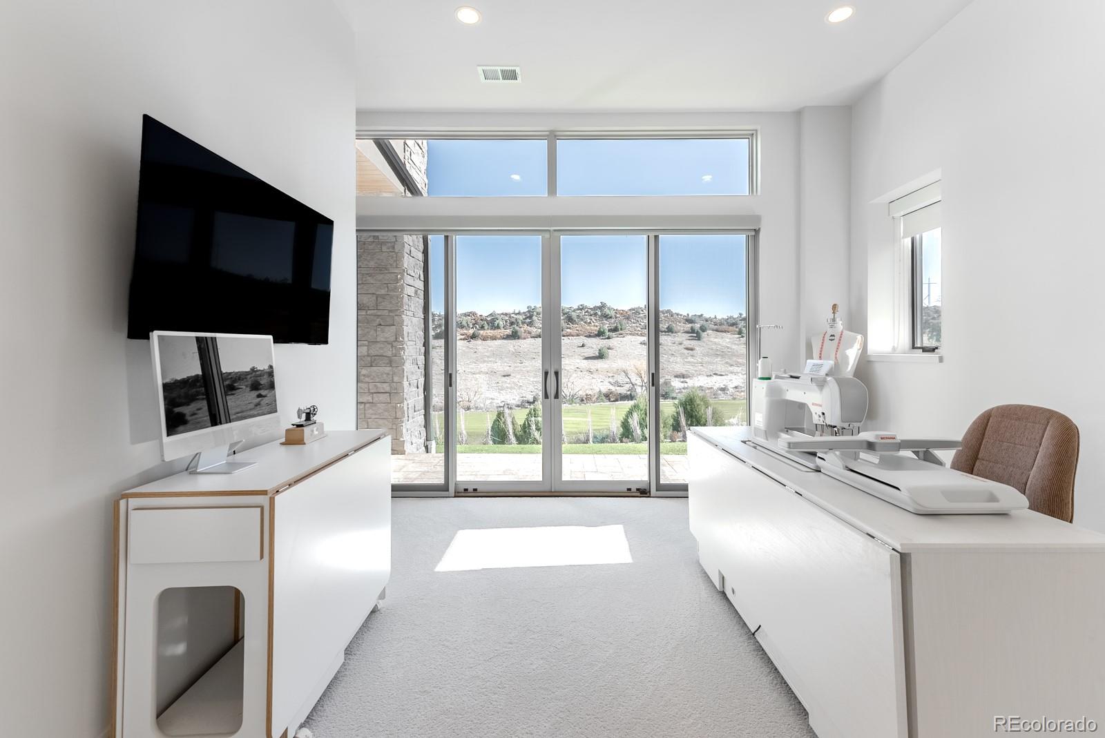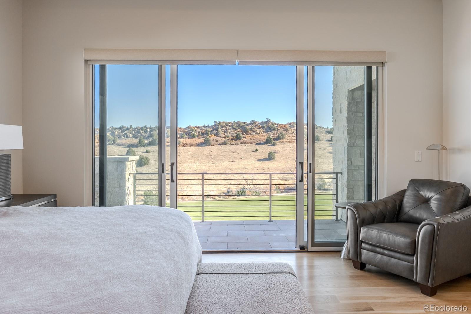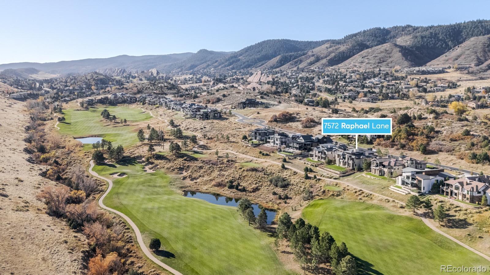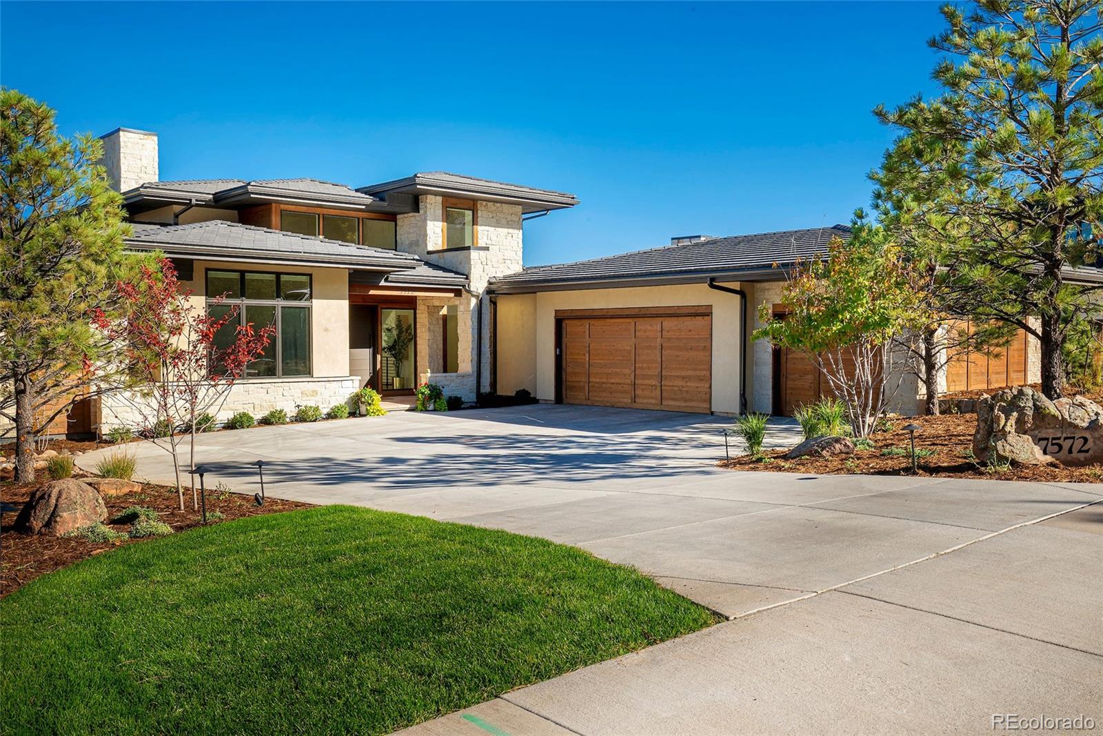 Privately elevated above the 12th and 15th fairways of the award-winning Ravenna Golf Club, this contemporary ranch estate commands an irreplaceable panorama of emerald greens undulating toward sparkling ponds, framed by dramatic red-rock formations and the Front Range beyond. Behind Ravenna's gates lies an elevated lifestyle of wellness, social connection and refined luxury where fine dining, fitness and nature exist in perfect harmony. An architectural statement, the modern facade fuses smooth stucco planes, limestone accents and linear rooflines for a composition both contemporary and timeless. Inside, white oak floors lead through voluminous sun-filled spaces where light and clean lines converge in sophisticated balance. The great room rises twenty feet beneath beamed ceilings and clerestory windows anchored by a sleek fireplace and wall of glass opening to a vast terrace overlooking the golf course and mountains. The kitchen presents as a culinary studio blending an ethereal palette with design precision, featuring a floating white-oak drop ceiling, eleven-foot quartz island, a suite of professional-grade appliances and a wet bar seamlessly connecting to the great room for effortless entertaining. The dining area, office and dramatic powder bath each continue the theme of artistry and polish. The primary suite is a sanctuary of calm with terrace access and breathtaking views, complemented by a spa bath with freestanding tub, poured-concrete vanities and boutique-style dressing closet. A statement staircase guides to the walk out lower level--a world of leisure with a billiards and media lounge, flagstone fireplace and a luminous back-lit quartzite bar with an impressive wine column. Three bedroom suites and a rejuvenating dry sauna room complete the level. Outside, over $100,000 in new landscaping introduces a lush lawn, cascading terraced gardens and a full-length patio offering multiple destinations for gathering and savoring the home's spectacular setting.