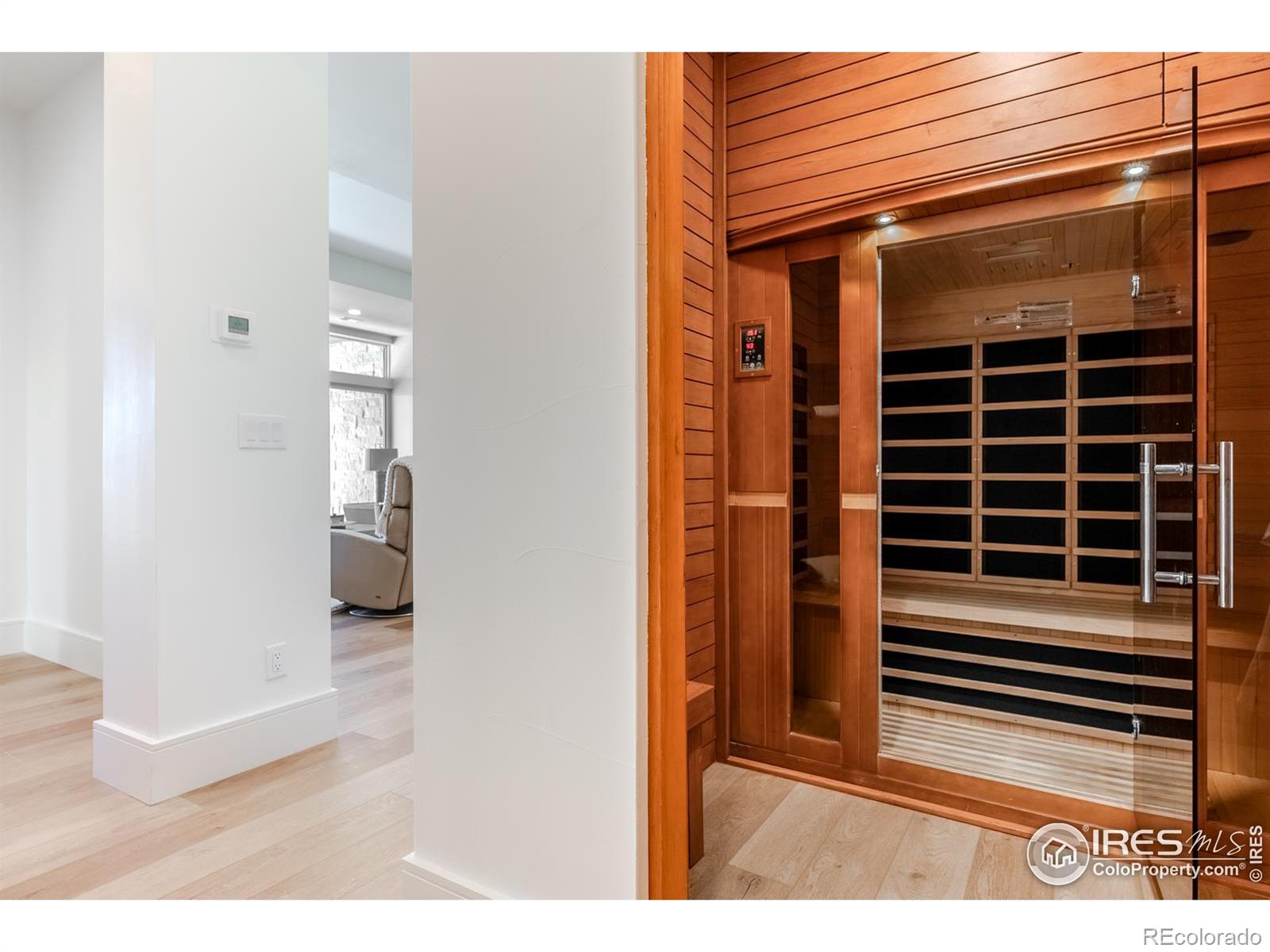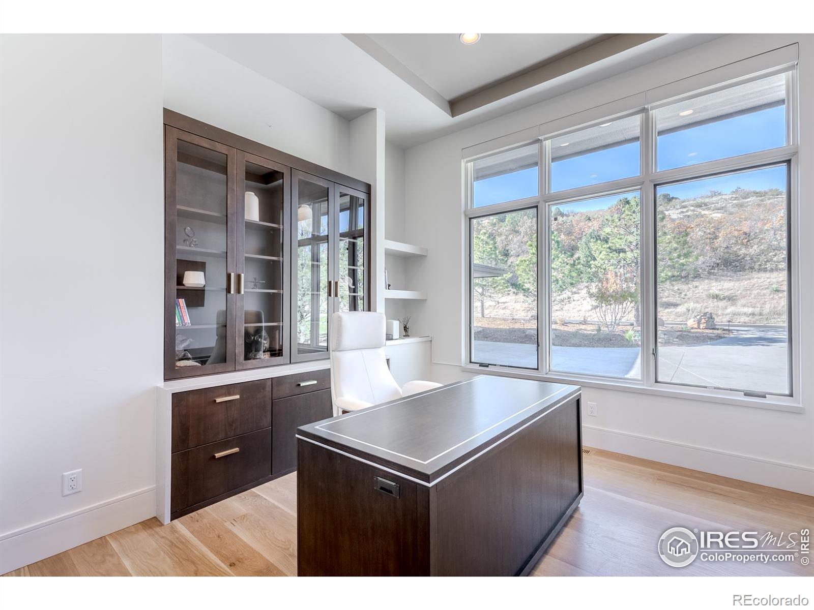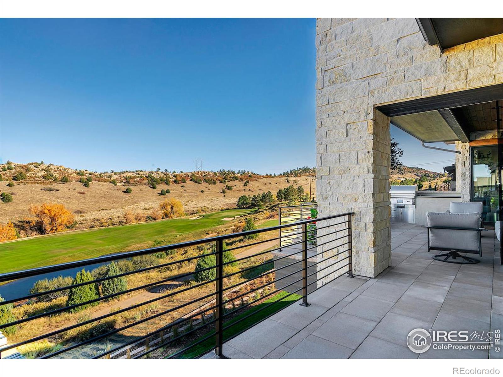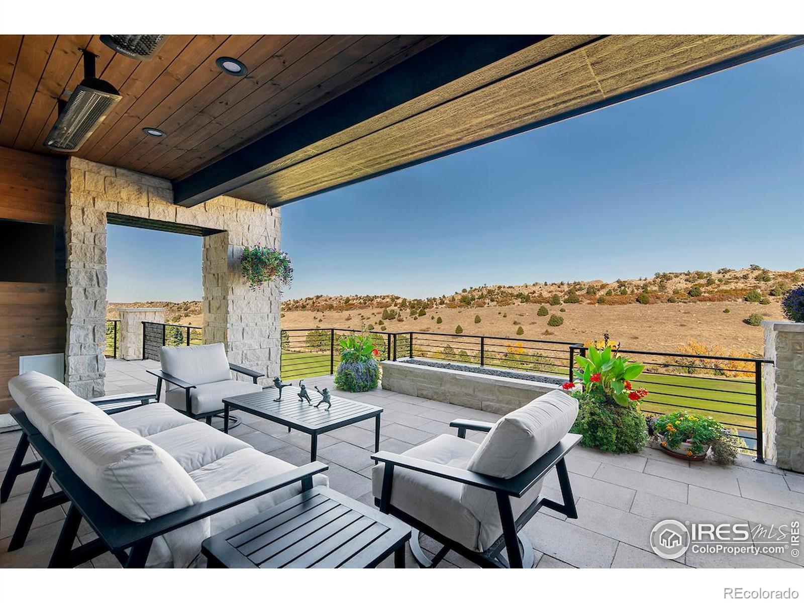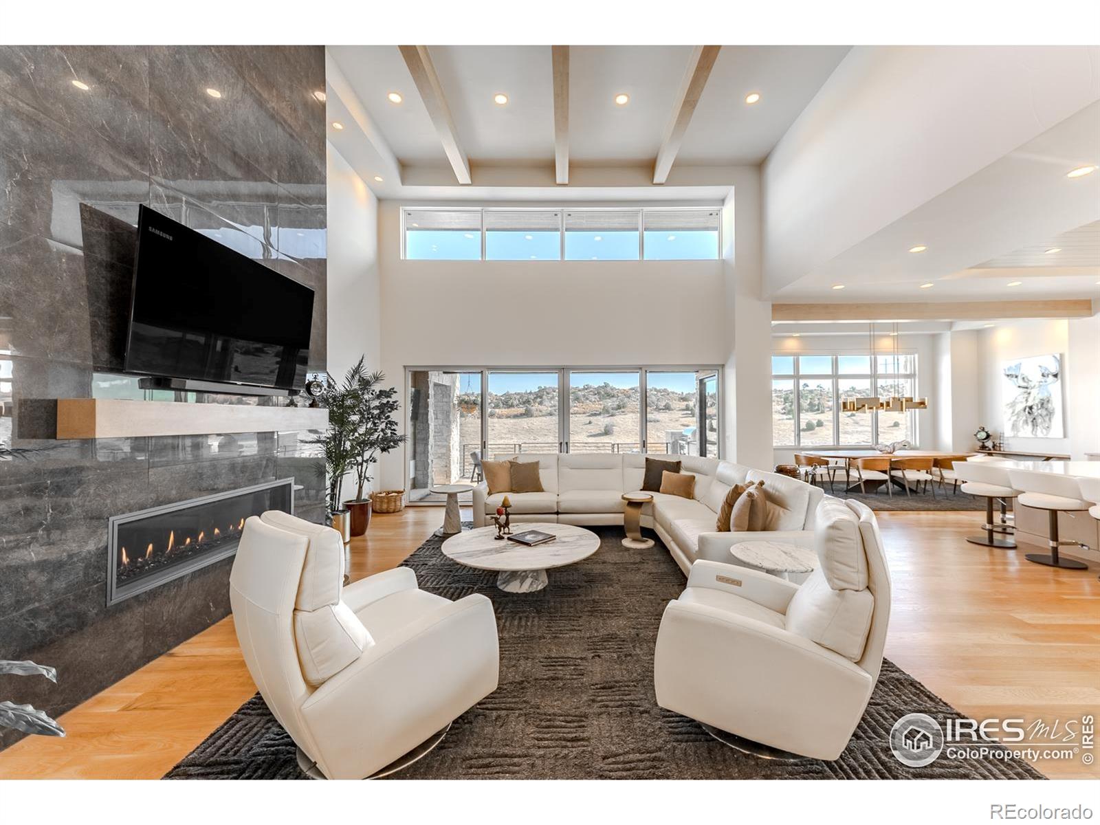 Privately elevated above the 12th and 15th fairways of the award-winning Ravenna Golf Club, this contemporary ranch estate commands an irreplaceable panorama of emerald greens undulating toward sparkling ponds, framed by dramatic red-rock formations and the Front Range beyond. Behind Ravenna's gates lies an elevated lifestyle of wellness, social connection and refined luxury where fine dining, fitness and nature exist in perfect harmony. An architectural statement, the modern facade fuses smooth stucco planes, limestone accents and linear rooflines for a composition both contemporary and timeless. Inside, white oak floors lead through voluminous sun-filled spaces where light and clean lines converge in sophisticated balance. The great room rises twenty feet beneath beamed ceilings and clerestory windows anchored by a sleek fireplace and wall of glass opening to a vast terrace overlooking the golf course and mountains. The kitchen presents as a culinary studio blending an ethereal palette with design precision, featuring a floating white-oak drop ceiling, eleven-foot quartz island, a suite of professional-grade appliances and a wet bar seamlessly connecting to the great room for effortless entertaining. The dining area, office and dramatic powder bath each continue the theme of artistry and polish. The primary suite is a sanctuary of calm with terrace access and breathtaking views, complemented by a spa bath with freestanding tub, poured-concrete vanities and boutique-style dressing closet. A statement staircase guides to the walk out lower level-a world of leisure with a billiards and media lounge, flagstone fireplace and a luminous back-lit quartzite bar with an impressive wine column. Three bedroom suites and a rejuvenating dry sauna room complete the level. Outside, over $100,000 in new landscaping introduces a lush lawn, cascading terraced gardens and a full-length patio offering multiple destinations for gathering and savoring the home's spectacular setting.