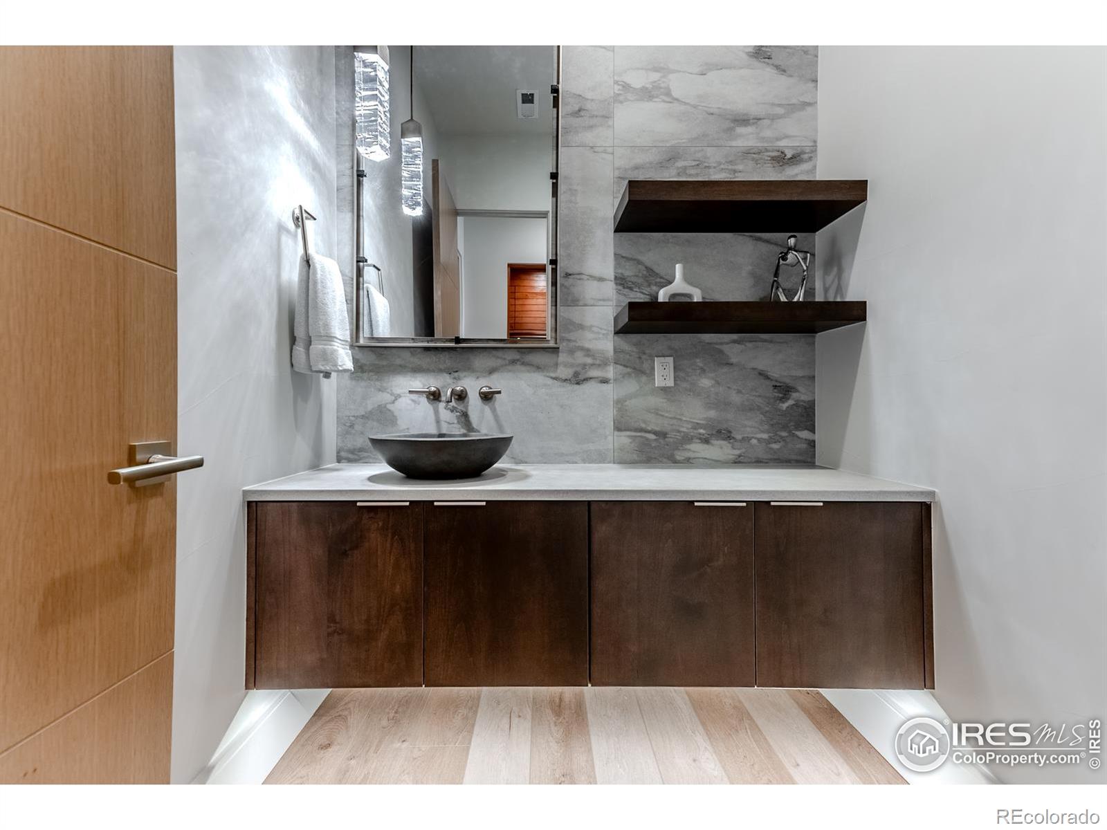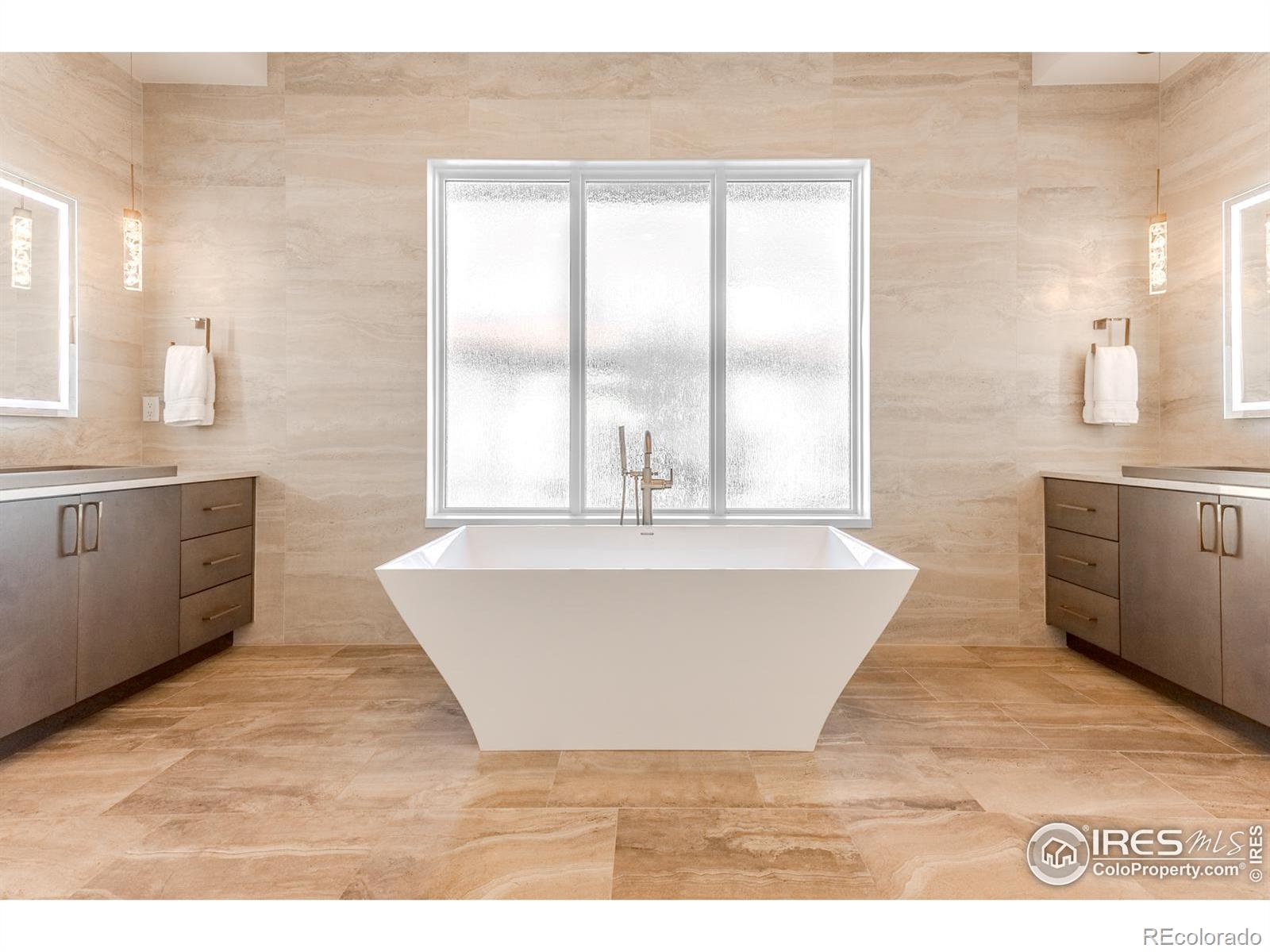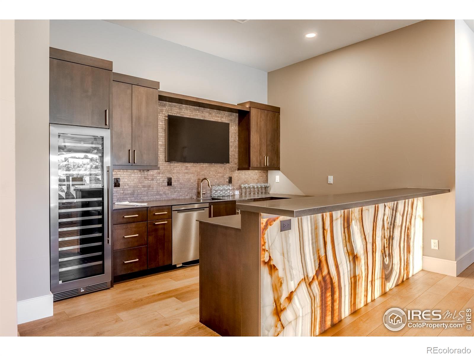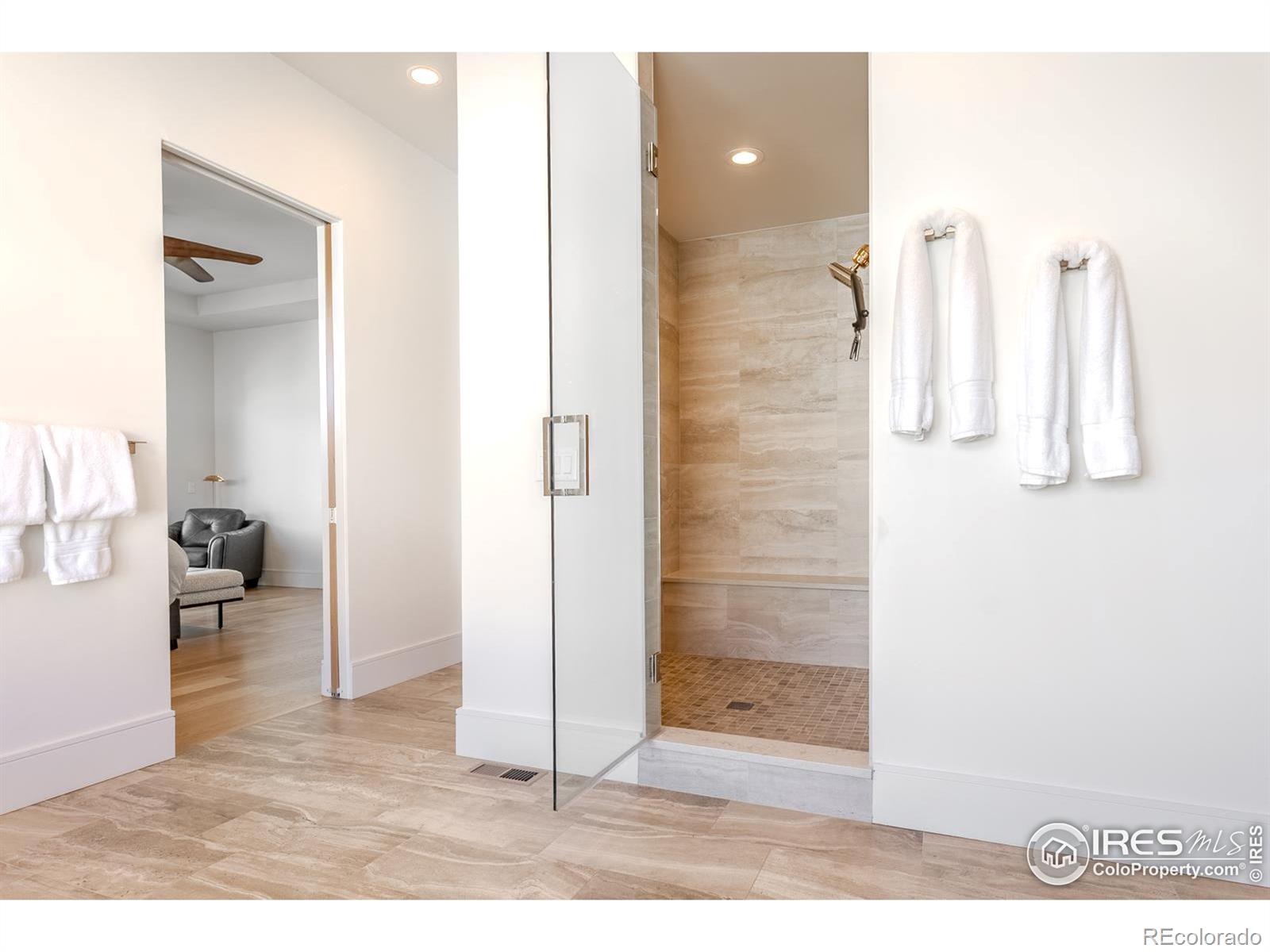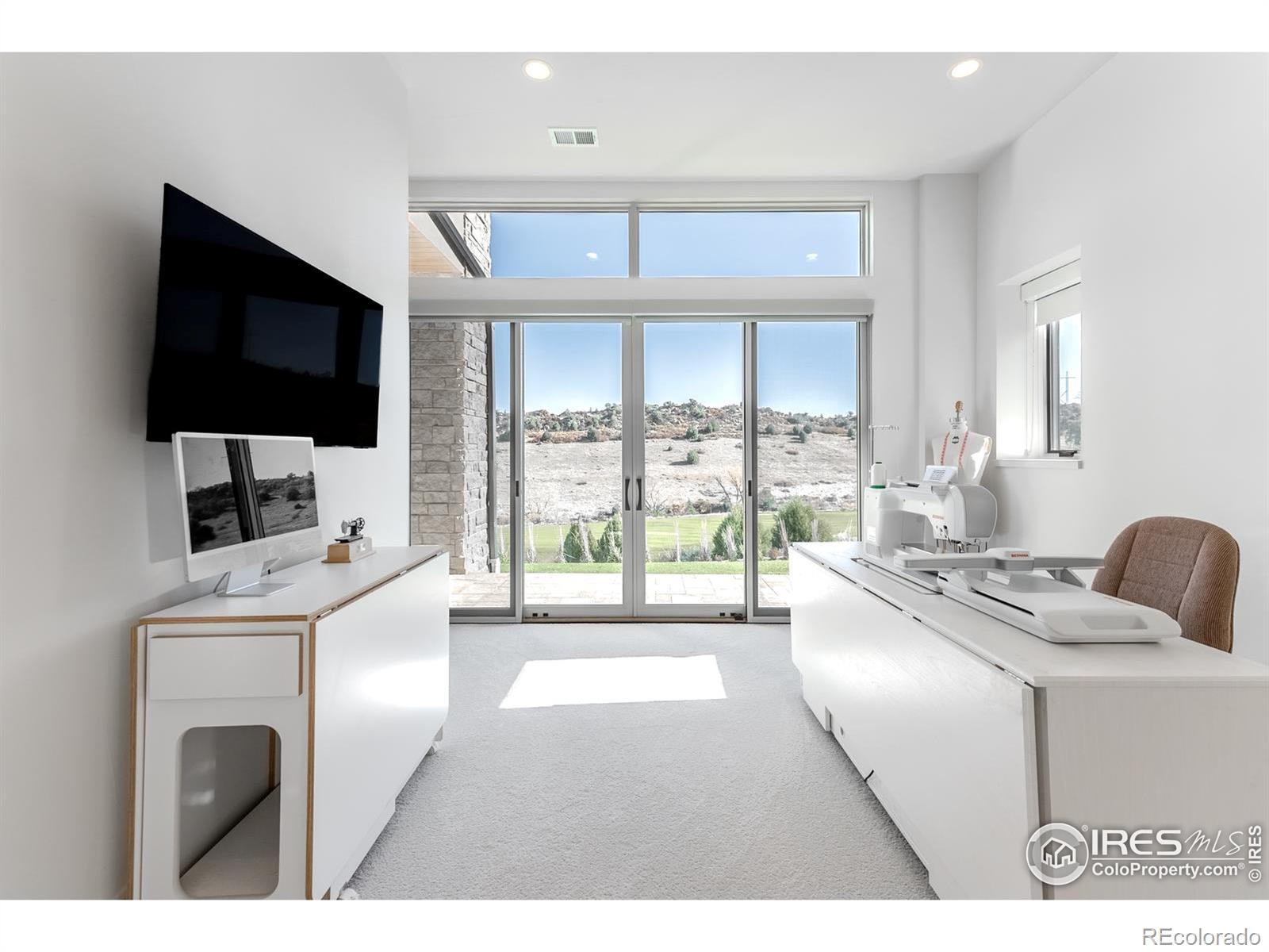 Privately elevated above the 12th and 15th fairways of the award-winning Ravenna Golf Club, this contemporary ranch estate commands an irreplaceable panorama of emerald greens undulating toward sparkling ponds, framed by dramatic red-rock formations and the Front Range beyond. Behind Ravenna's gates lies an elevated lifestyle of wellness, social connection and refined luxury where fine dining, fitness and nature exist in perfect harmony. An architectural statement, the modern facade fuses smooth stucco planes, limestone accents and linear rooflines for a composition both contemporary and timeless. Inside, white oak floors lead through voluminous sun-filled spaces where light and clean lines converge in sophisticated balance. The great room rises twenty feet beneath beamed ceilings and clerestory windows anchored by a sleek fireplace and wall of glass opening to a vast terrace overlooking the golf course and mountains. The kitchen presents as a culinary studio blending an ethereal palette with design precision, featuring a floating white-oak drop ceiling, eleven-foot quartz island, a suite of professional-grade appliances and a wet bar seamlessly connecting to the great room for effortless entertaining. The dining area, office and dramatic powder bath each continue the theme of artistry and polish. The primary suite is a sanctuary of calm with terrace access and breathtaking views, complemented by a spa bath with freestanding tub, poured-concrete vanities and boutique-style dressing closet. A statement staircase guides to the walk out lower level-a world of leisure with a billiards and media lounge, flagstone fireplace and a luminous back-lit quartzite bar with an impressive wine column. Three bedroom suites and a rejuvenating dry sauna room complete the level. Outside, over $100,000 in new landscaping introduces a lush lawn, cascading terraced gardens and a full-length patio offering multiple destinations for gathering and savoring the home's spectacular setting.